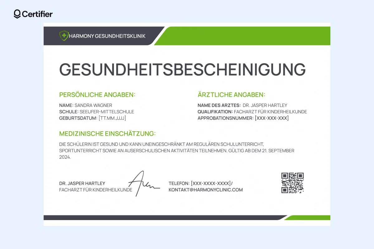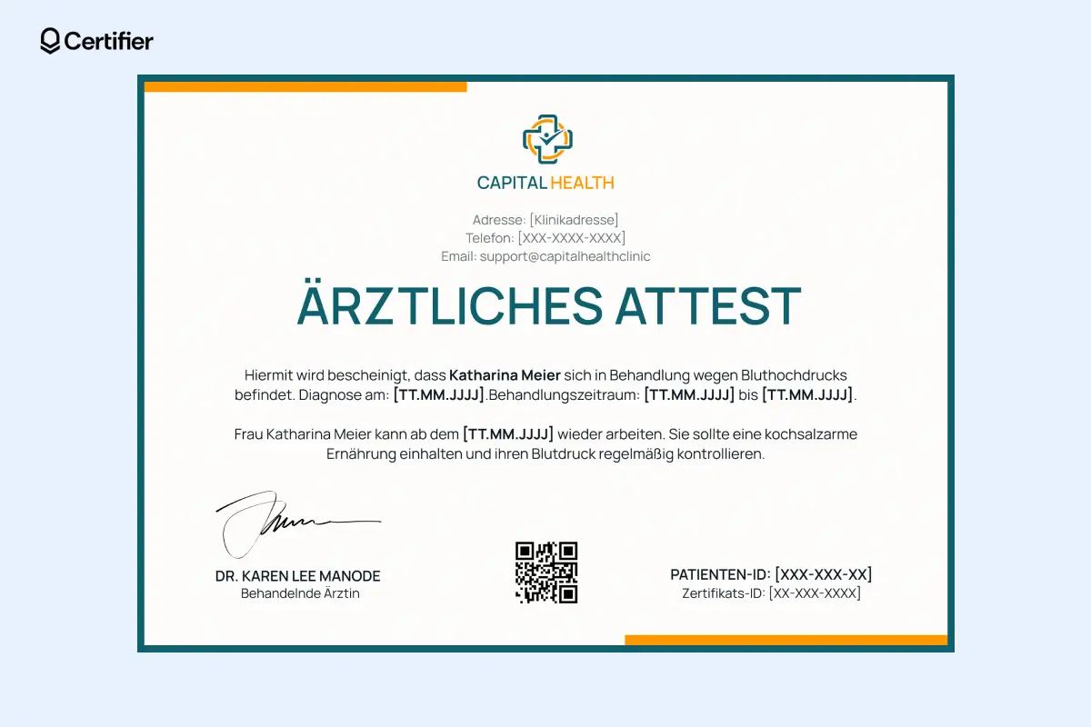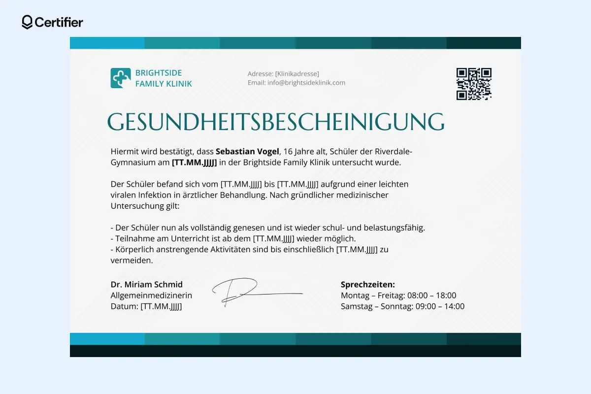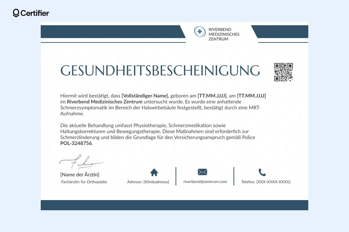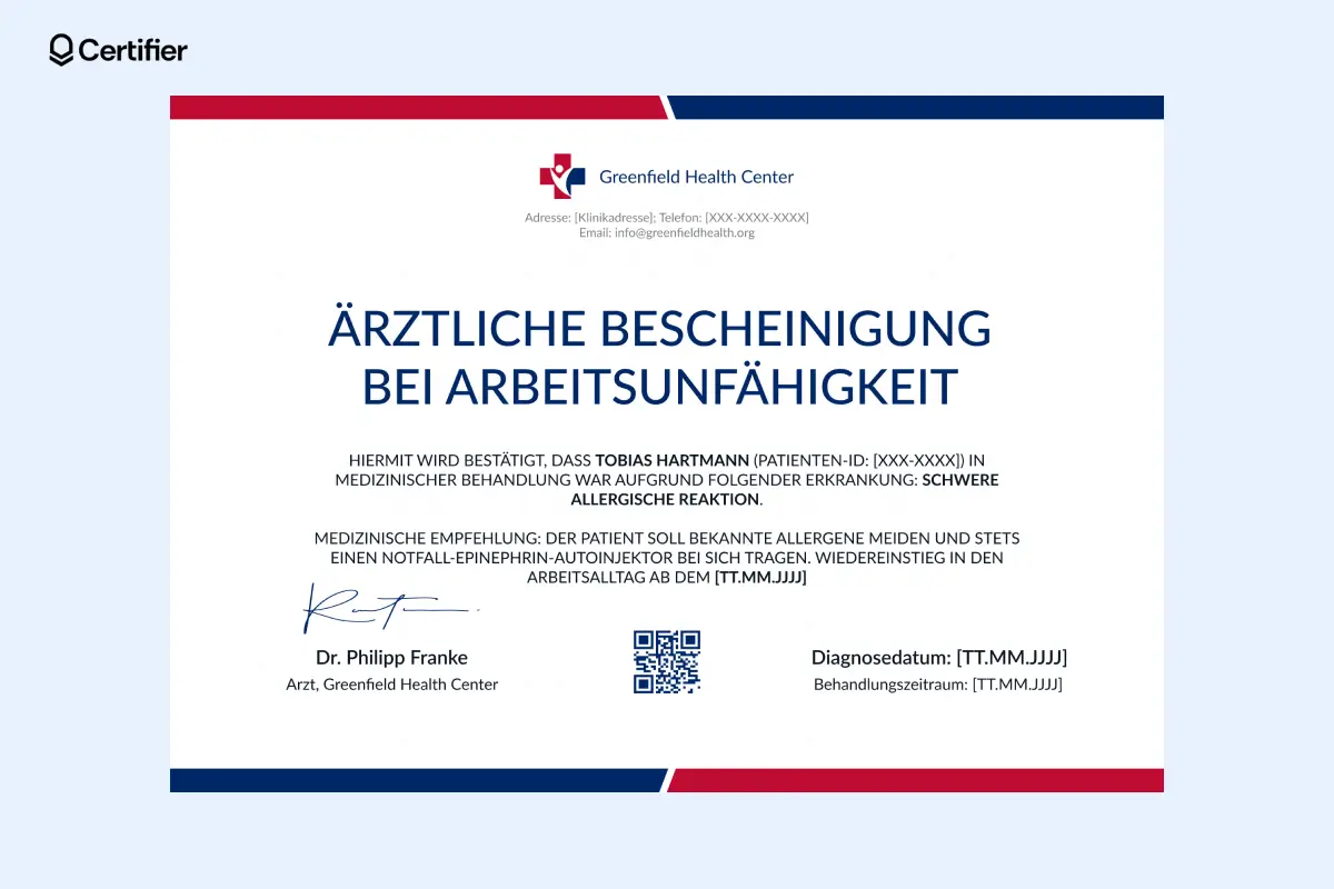 Mit einzigartiger Zertifikats-ID, QR-Code und professionellem Layout eignet sie sich für Arztpraxen, Versicherungen und Personalabteilungen.