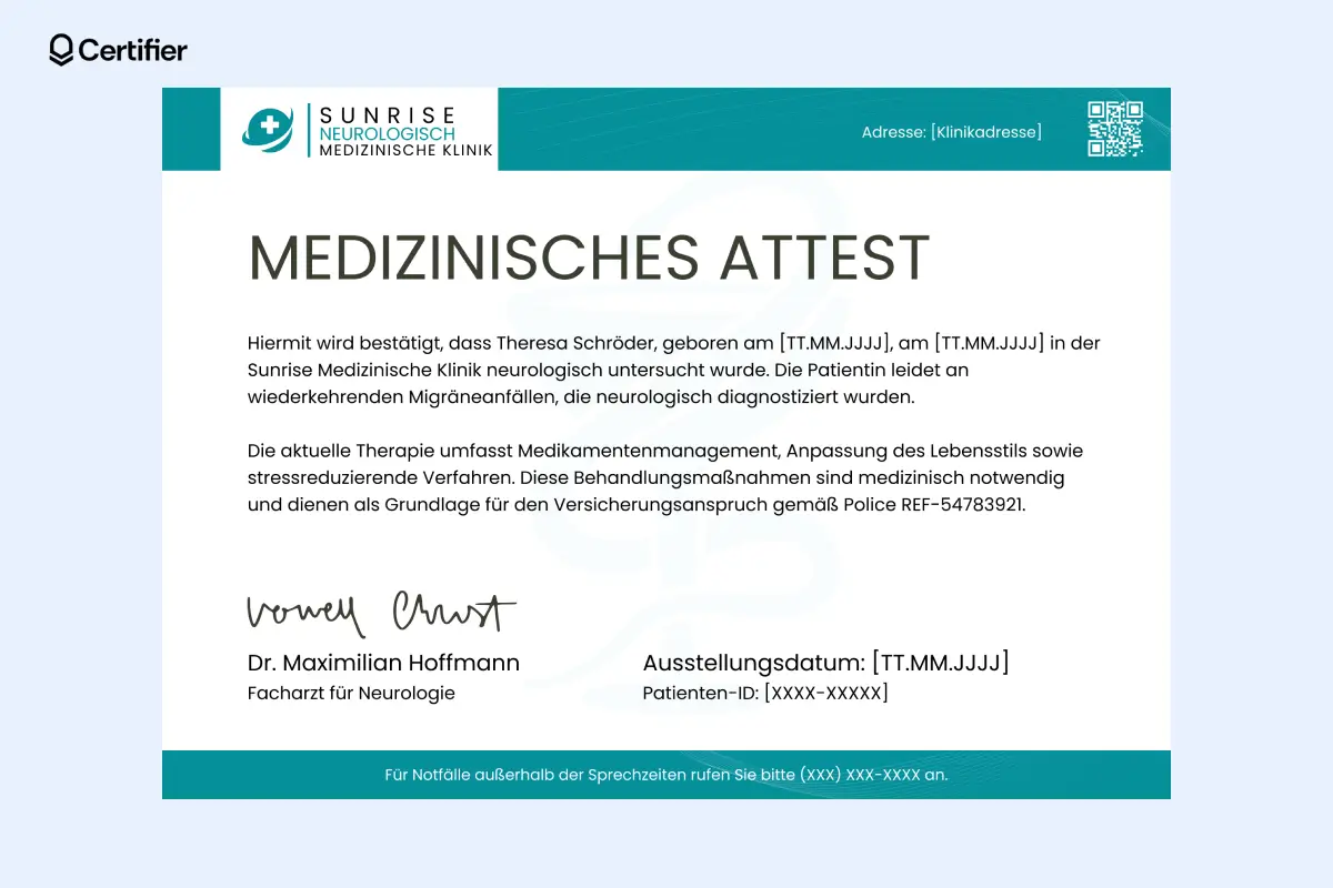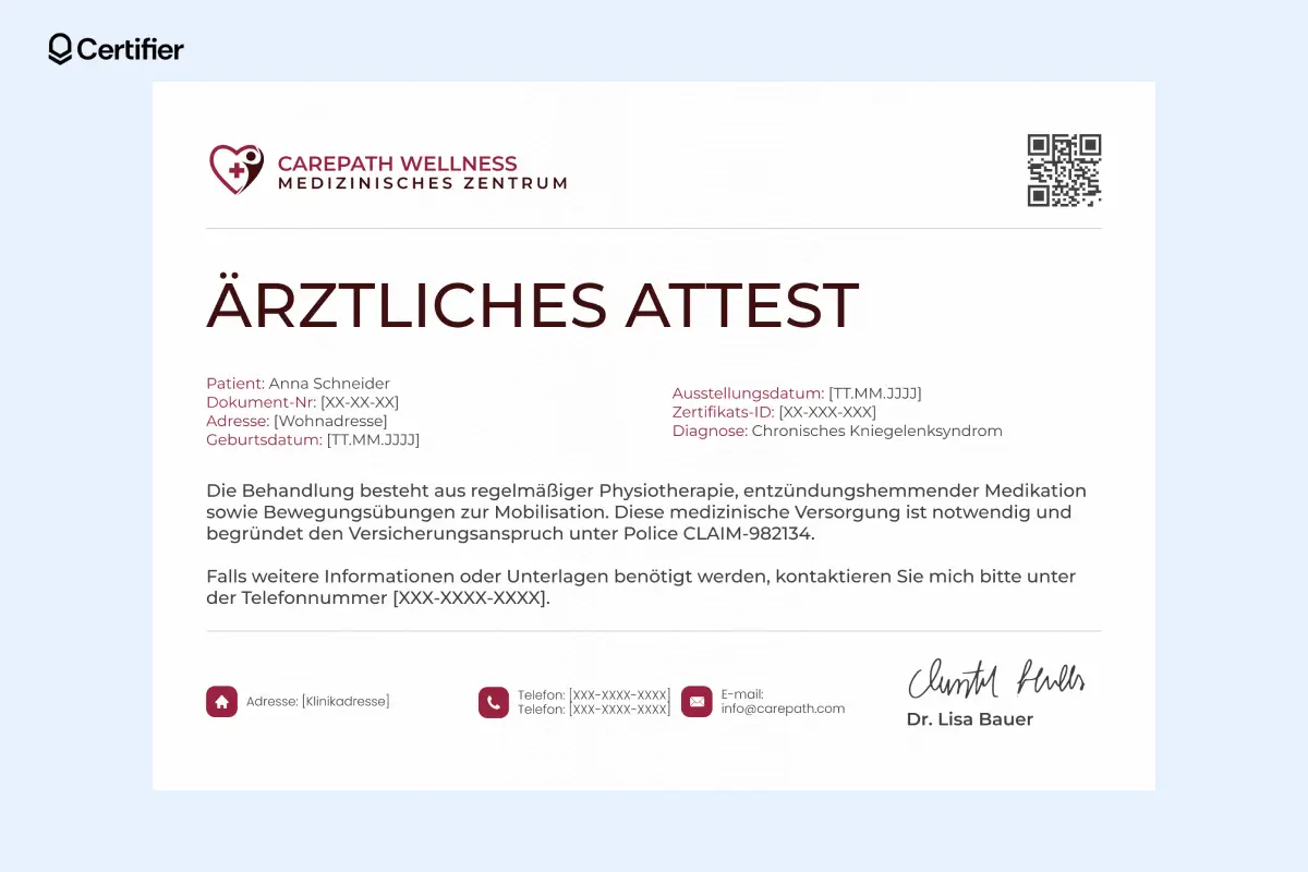 Besonders geeignet für Fachärzte, die strukturiert und sicher medizinische Nachweise ausstellen möchten – digital verifizierbar über QR-Code.