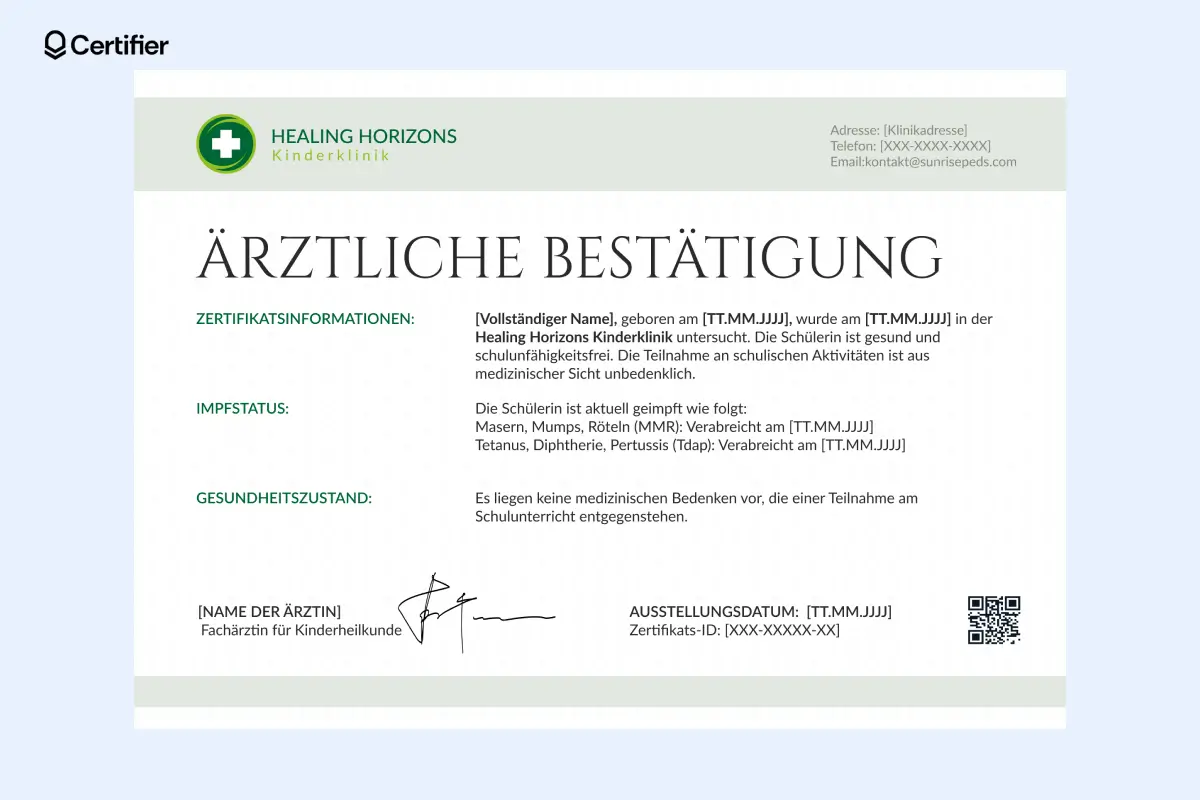 Das qualifiziertes ärztliches Attest Muster ist kostenlos verfügbar und optimal für schulische Freigaben. Selbst designen? Zertifikat erstellen mit Canva.