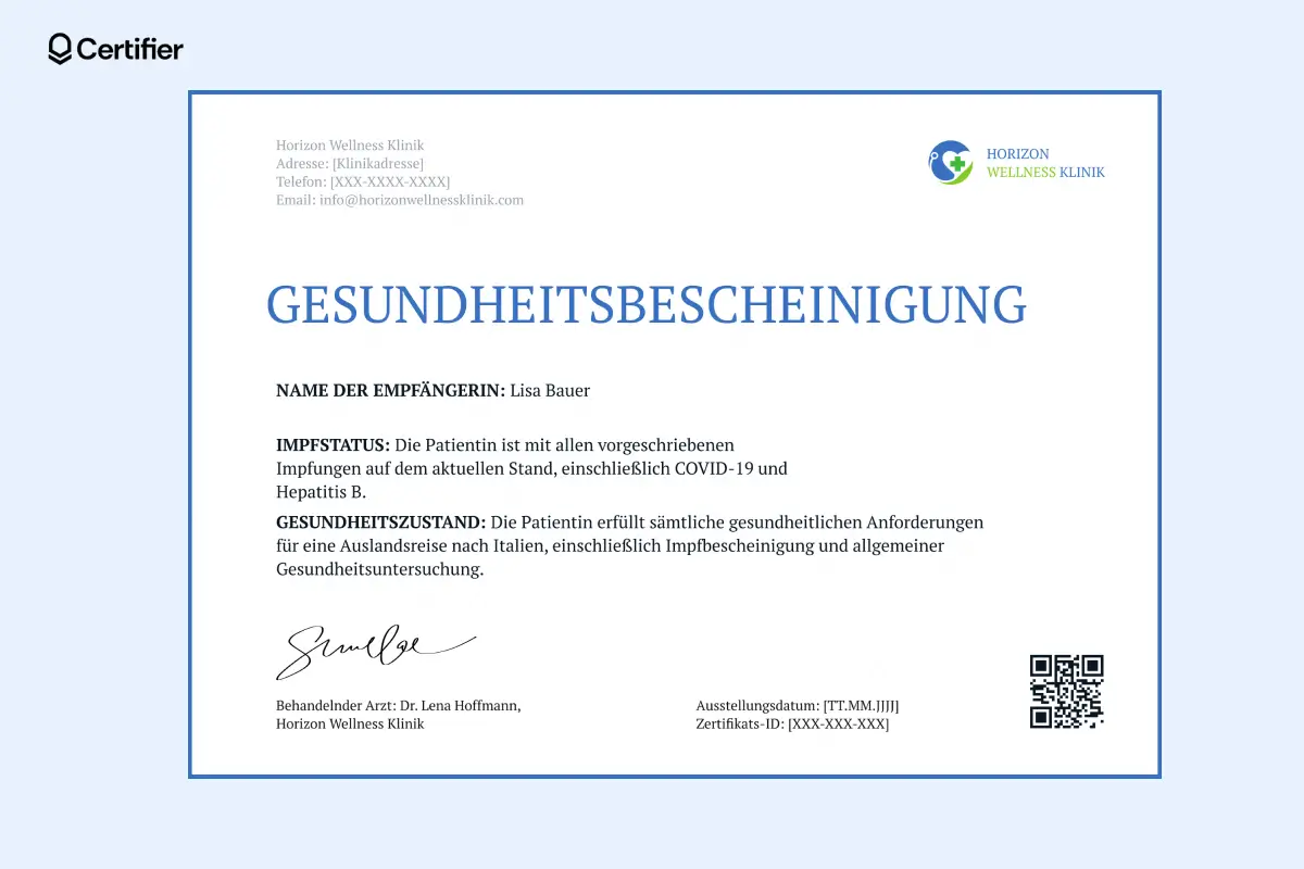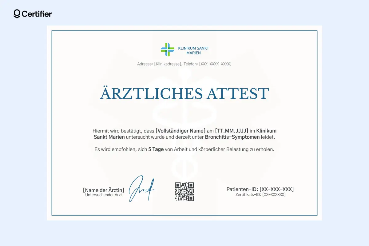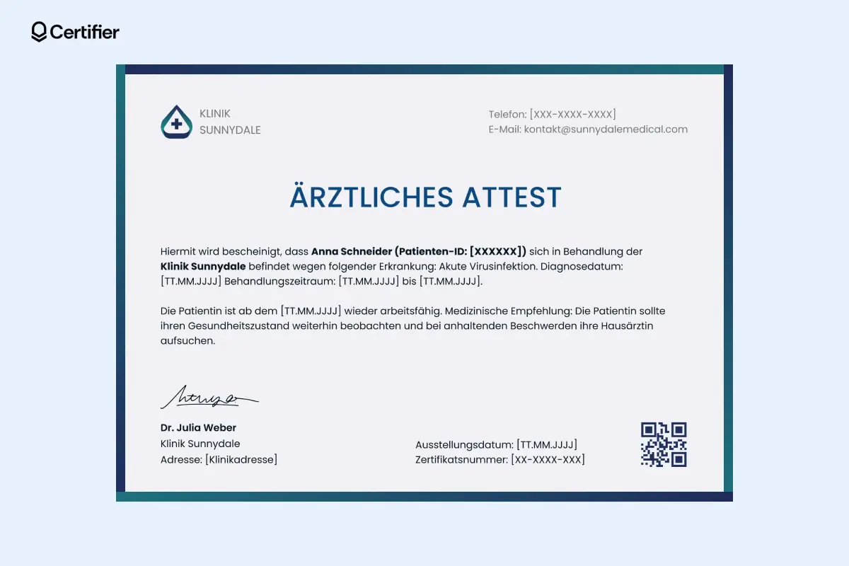 Das ärztliches Attest zum Ausdrucken kann direkt per QR-Code verifiziert werden. Mehr Infos zur Online-Ausstellung: Wie Sie ein Zertifikat online erstellen.
