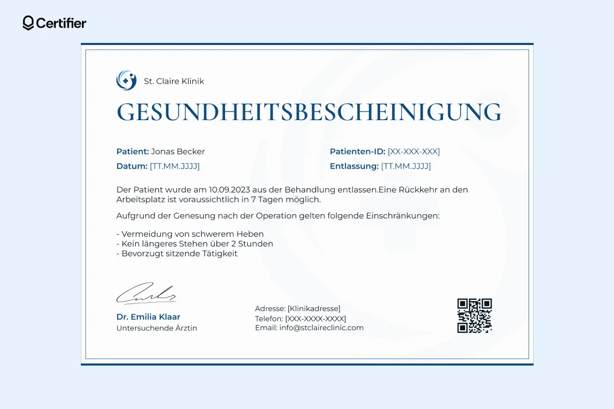 Möchten Sie Ihren Arbeitsablauf optimieren? Dann testen Sie Certifier und sehen Sie selbst, wie schnell Sie perfekte ärztliche Attest Vorlage Gesundheitszeugnis erstellen können.