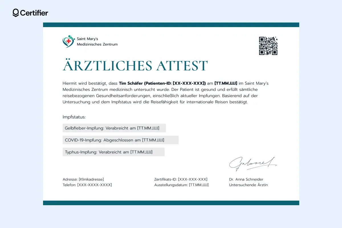 Die qualifiziertes ärztliches Attest Vorlage ist ideal zur Vorbereitung auf internationale Reisen. Sie enthält Felder für Impfnachweise, Flugtauglichkeit und Patientendaten – alles digital verifizierbar per QR-Code.